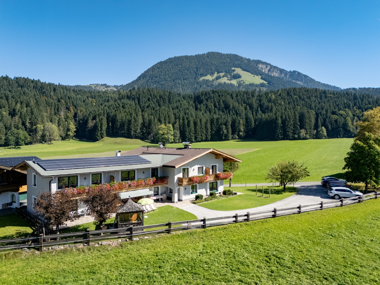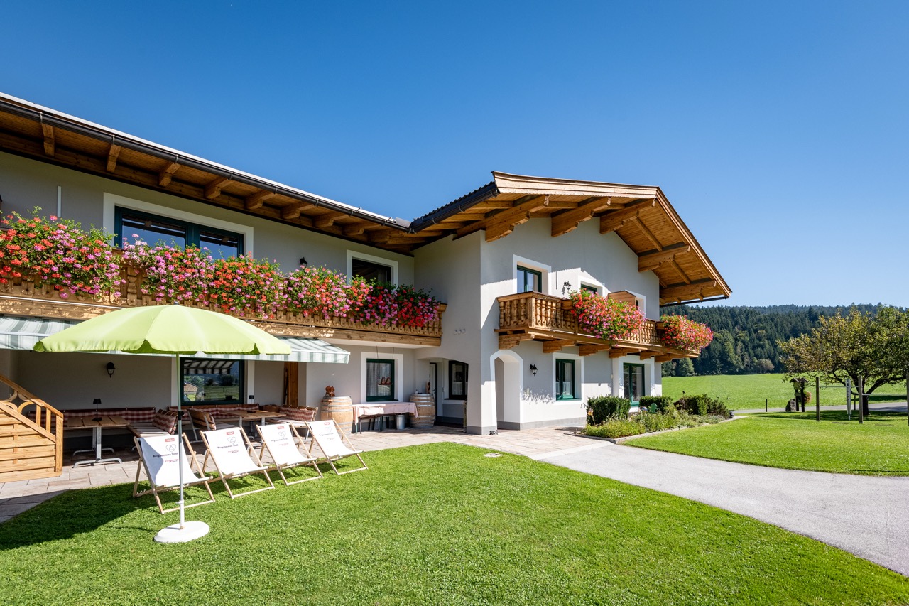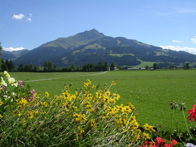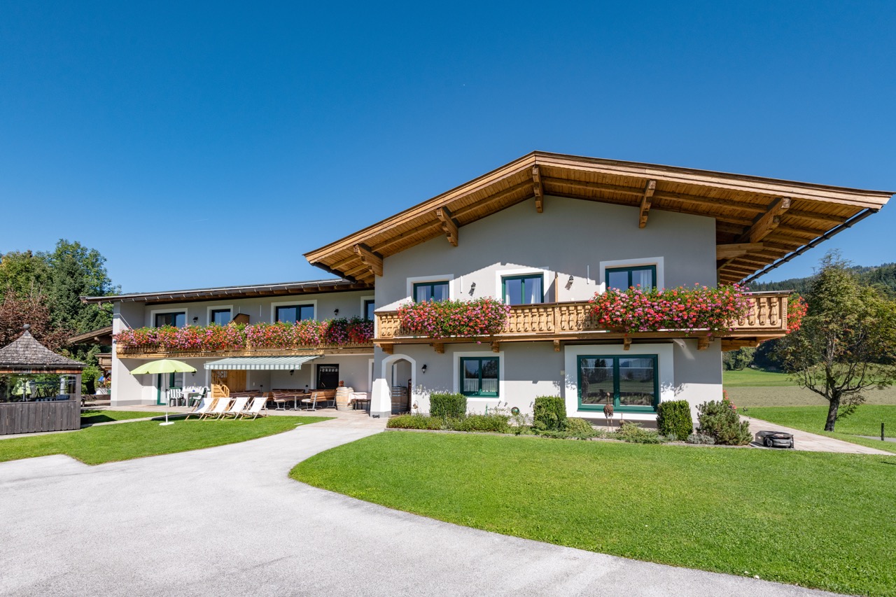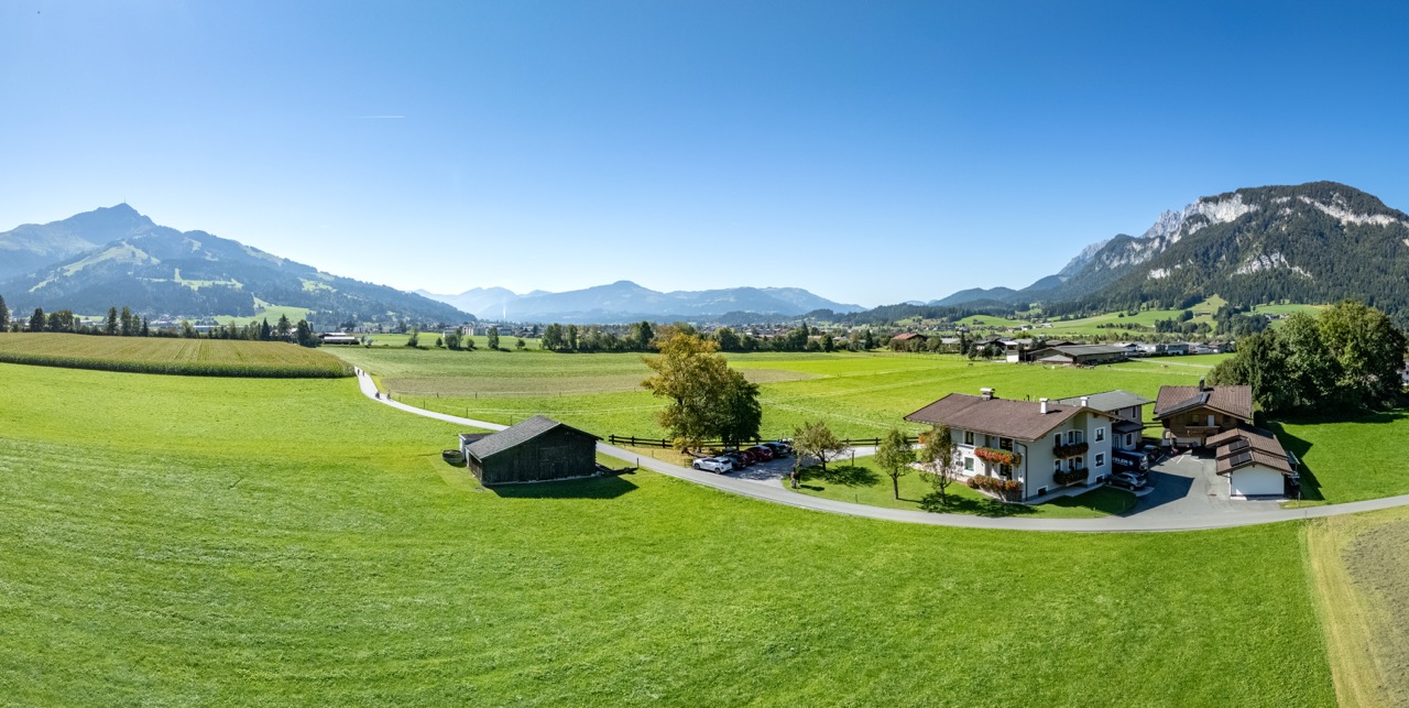 Das Haus, im Tiroler Stil erbaut, liegt inmitten von Wiesen, umrahmt vom Wilden Kaiser und Kitzbüheler Horn, ca. drei Autominuten von Kirchdorf und St. Johann entfernt.